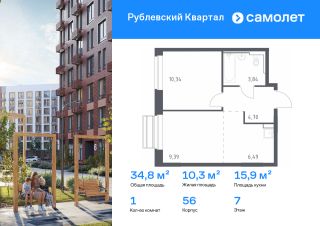 Строим кварталы для жизни с заботой о будущем. Предлагается 1-комнатная квартира комфорт-класса 34,76 кв.м в корпусе 56 на 7 этаже, в ЖК "Рублевский Квартал"