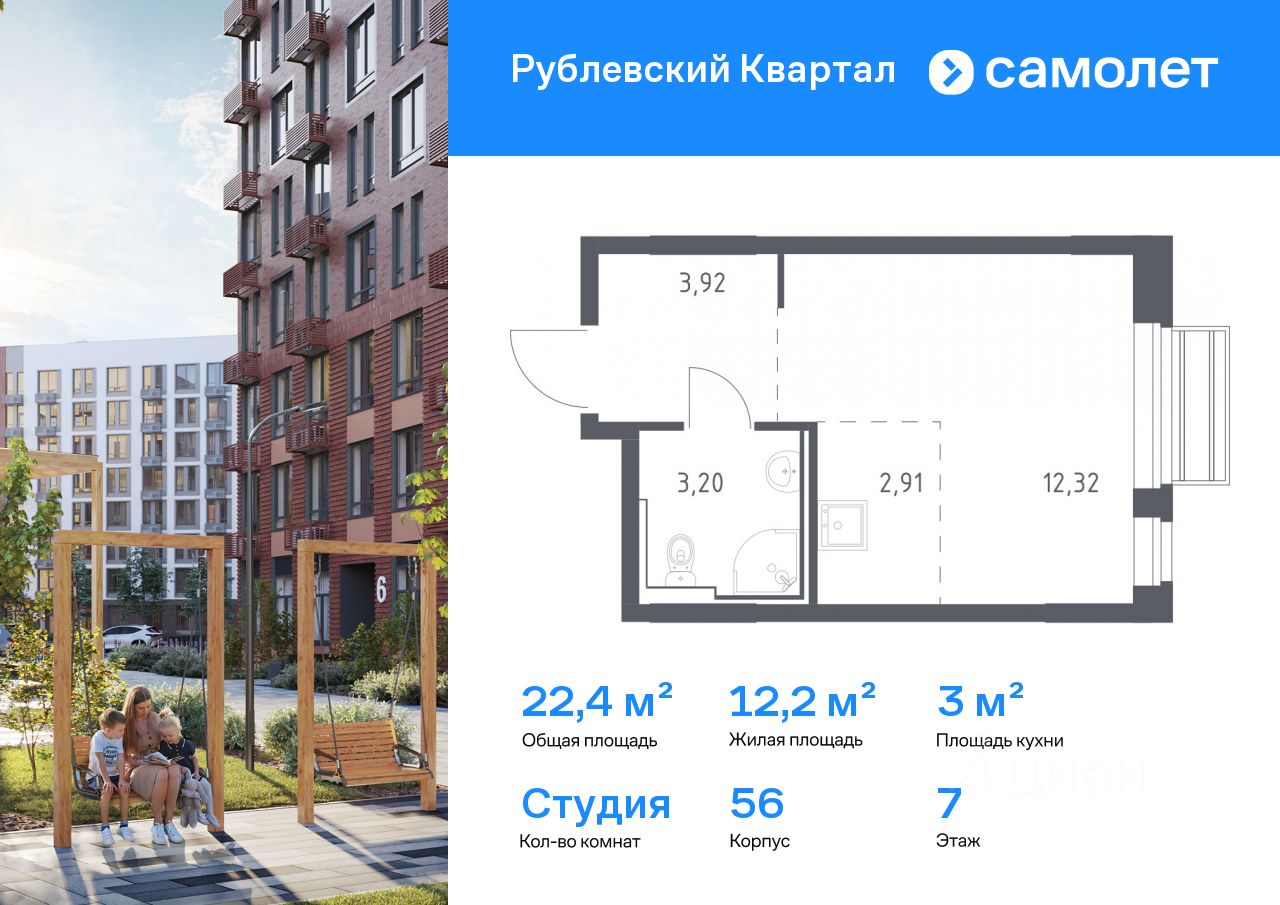 Строим кварталы для жизни с заботой о будущем. Предлагается квартира студия комфорт-класса 22,35 кв.м в корпусе 56 на 7 этаже, в ЖК "Рублевский Квартал"