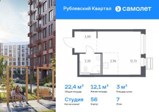 Строим кварталы для жизни с заботой о будущем. Предлагается квартира студия комфорт-класса 22,38 кв.м в корпусе 56 на 7 этаже, в ЖК "Рублевский Квартал"