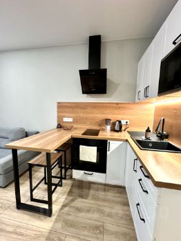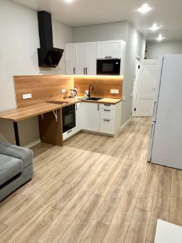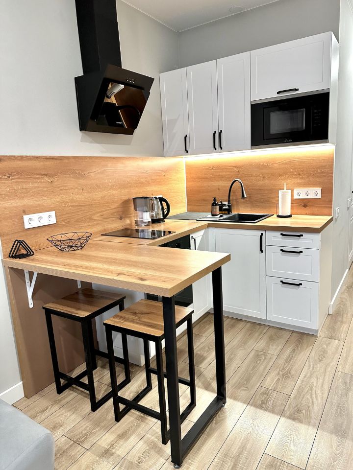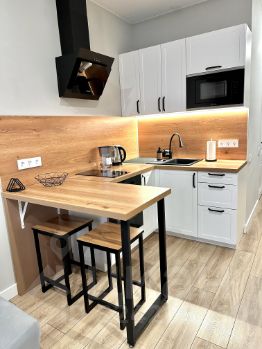 1. Кухня - холодильник, электрический чайник, варочная панель, микроволновая печь, вытяжка, духовка, мобильный приставной стол (можно перемещать и поворачивать).