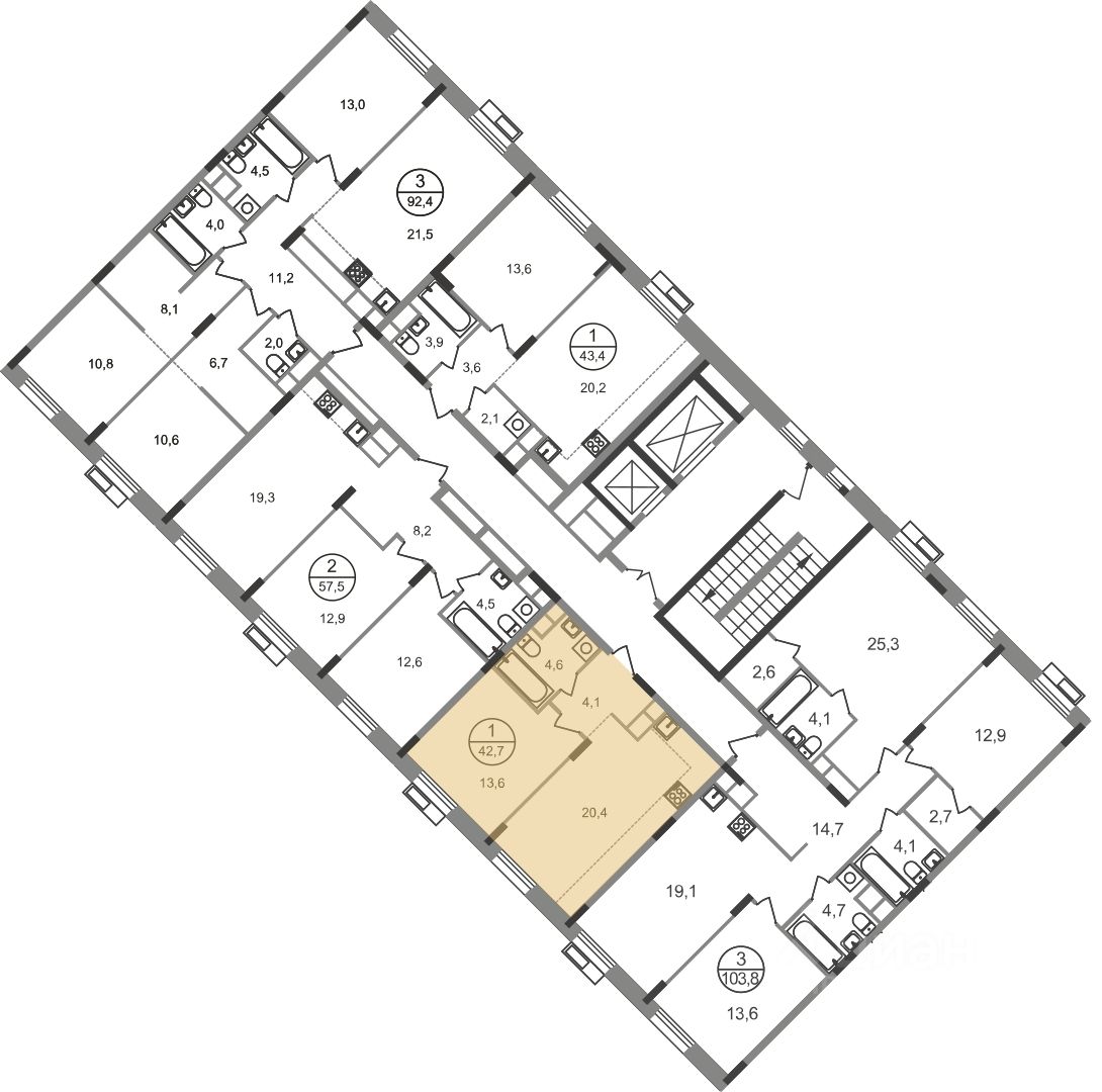 Общая площадь квартиры - 42,7 кв. м, этаж 7 из 9.