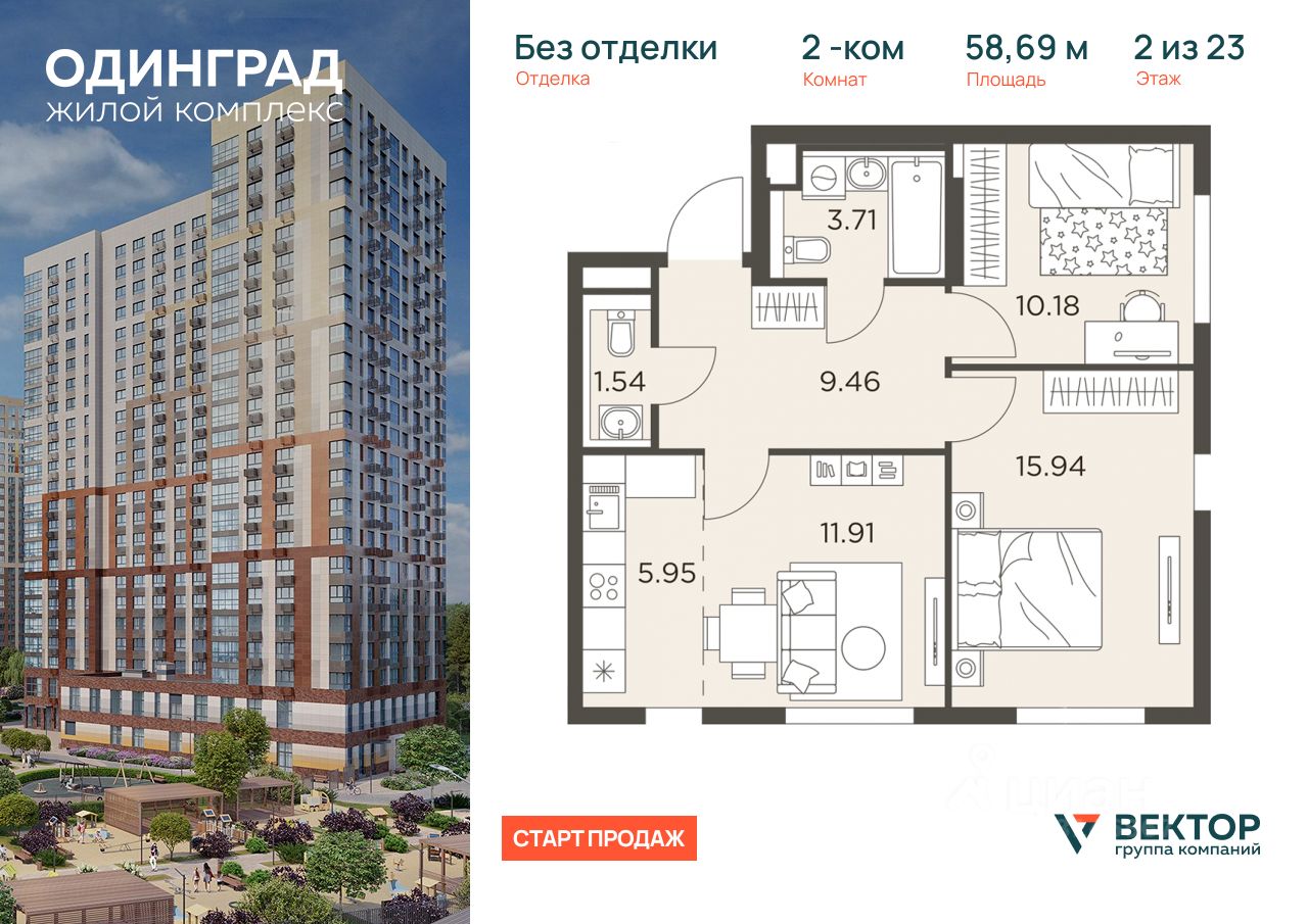 Прямая продажа от застройщика. Продается 2-комн. квартира площадью 58,69 кв.м на 2 этаже 23 этажного дома в ЖК "Одинград" от федерального девелопера ГК "Вектор".
