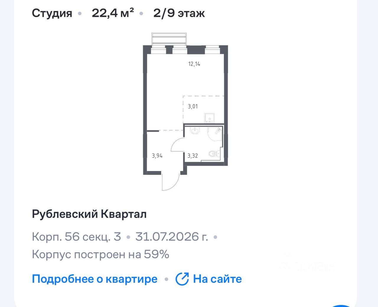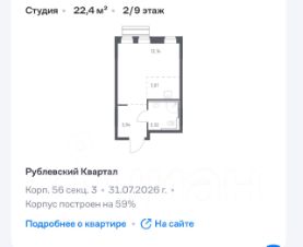 Продаётся уютная квартира-студия с готовой отделкой от застройщика площадью 22.4 квадратных метра в живописном районе Одинцовского городского округа, в ЖК Рублёвский квартал: