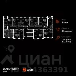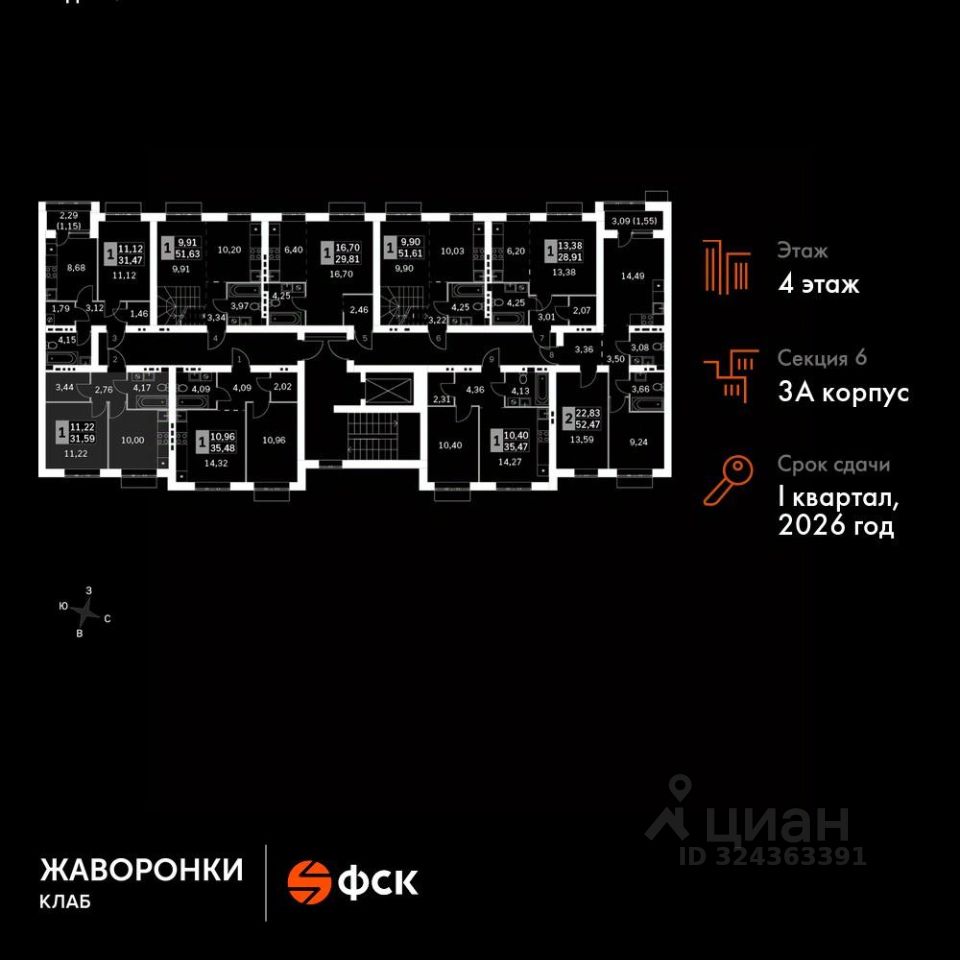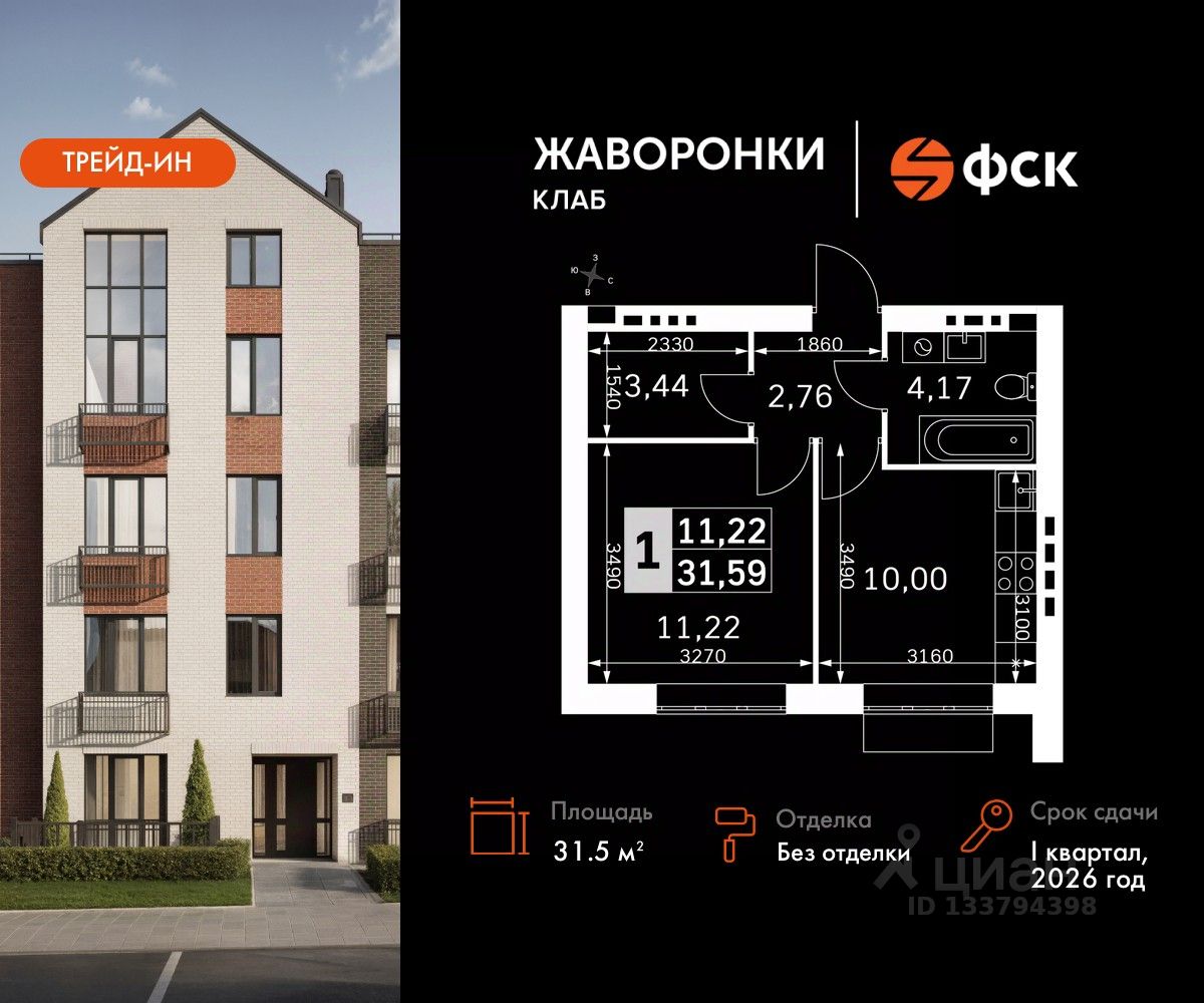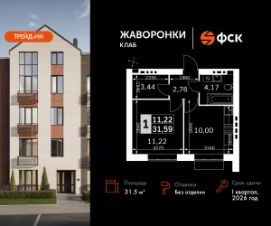 Продаётся 1-к квартира номер 135 общей площадью 31.59 кв.м на 4-м этаже 4 этажного дома. Без отделки.