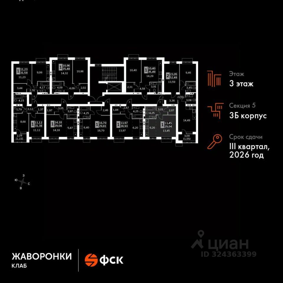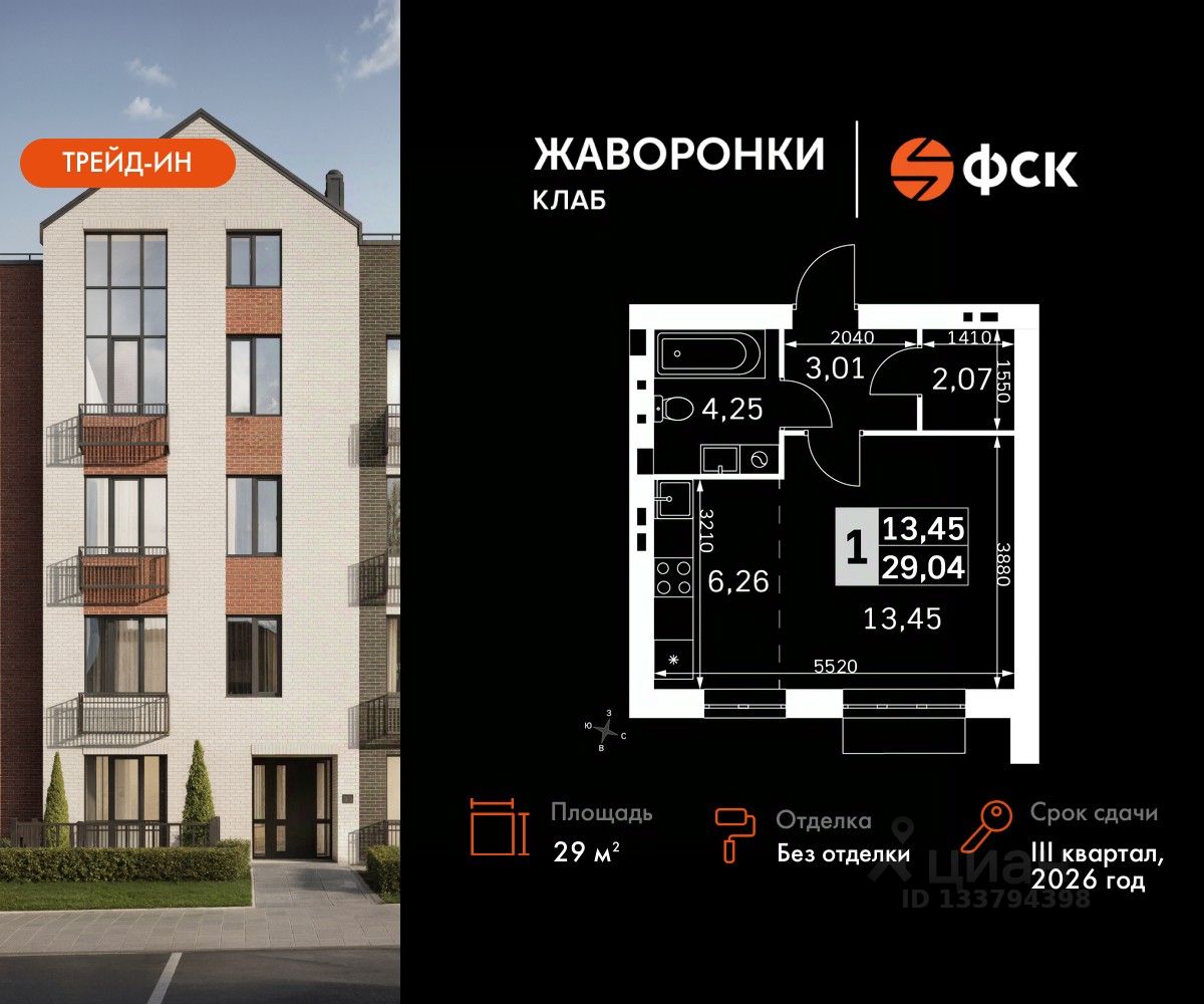Продаётся студия номер 89 общей площадью 29.04 кв.м на 3-м этаже 4 этажного дома. Без отделки.
