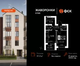 Продаётся 1-к квартира номер 93 общей площадью 31.38 кв.м на 3-м этаже 4 этажного дома. Без отделки.