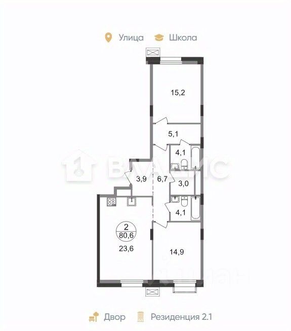 Планировка квартиры продумана до мелочей: две изолированные комнаты (15,2 кв. м и 14,9 кв. м), просторная кухня-гостиная (23,6 кв. м) и два совмещённых санузла. Окна выходят на улицу, с видом на школу и в тихий двор, обеспечивая достаточное естественное освещение. Квартира продаётся с ремонтом white box, что позволяет новым владельцам воплотить свои дизайнерские идеи без дополнительных затрат на черновую отделку.