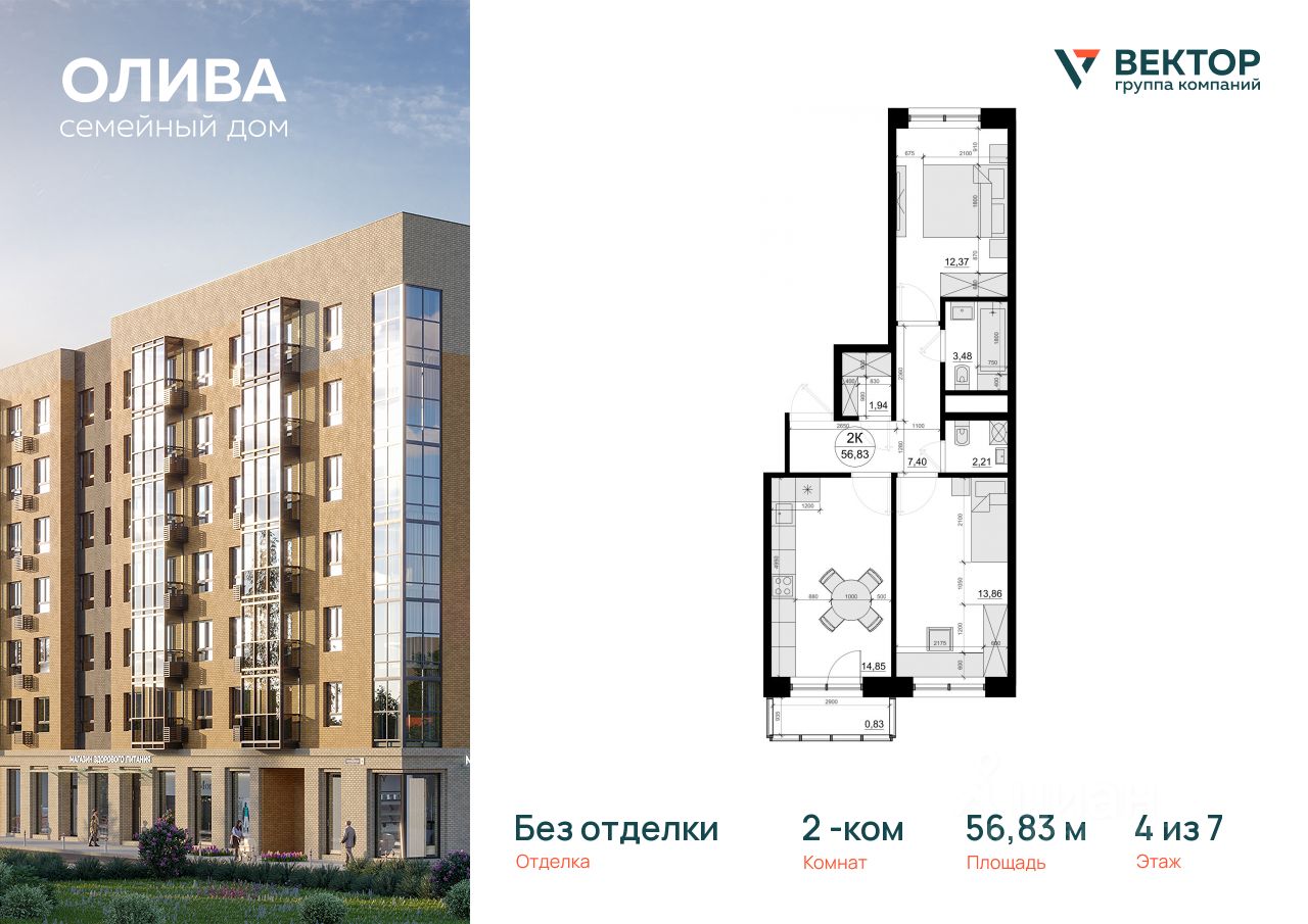 Продается 2-комн. квартира площадью 56,83 кв.м на 4 этаже 7 этажного дома в ЖК "Семейный дом Олива" от федерального девелопера ГК "Вектор".