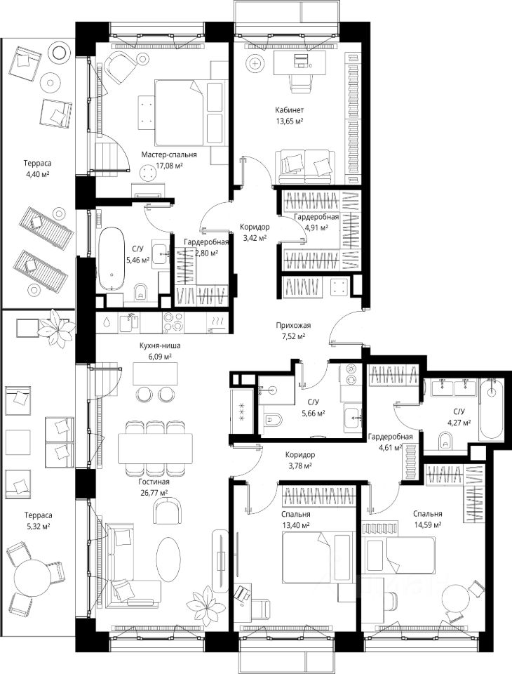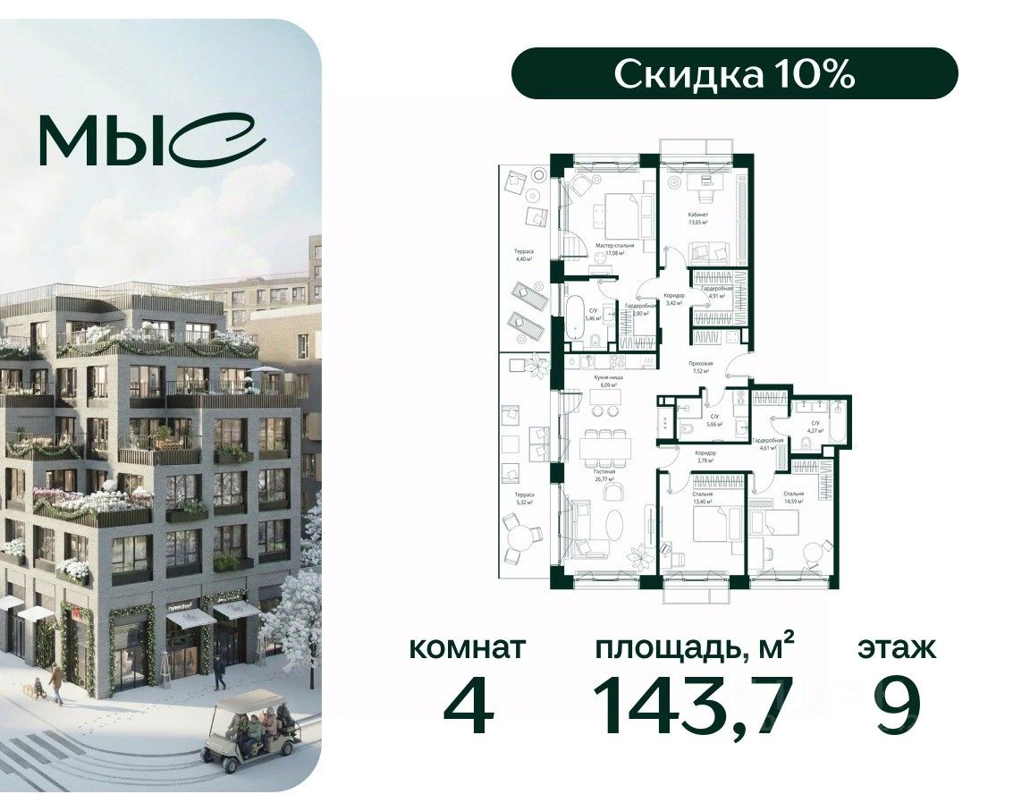 Продаётся 4-комнатная квартира общей площадью 143.73 м² без отделки в премиальном жилом комплексе "МЫС" на 9-м этаже 12 этажного дома. Квартира расположена в корпусе "Волга".