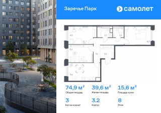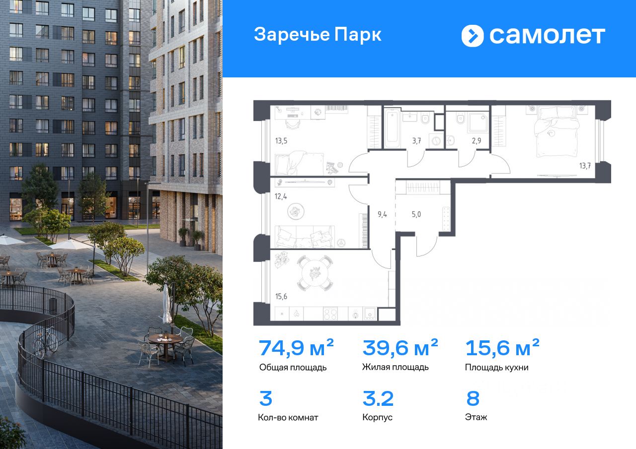 Строим кварталы для жизни с заботой о будущем. Предлагается 3-комнатная квартира бизнес-класса 74,9 кв.м в корпусе 3.2 на 8 этаже, в ЖК "Заречье Парк"
