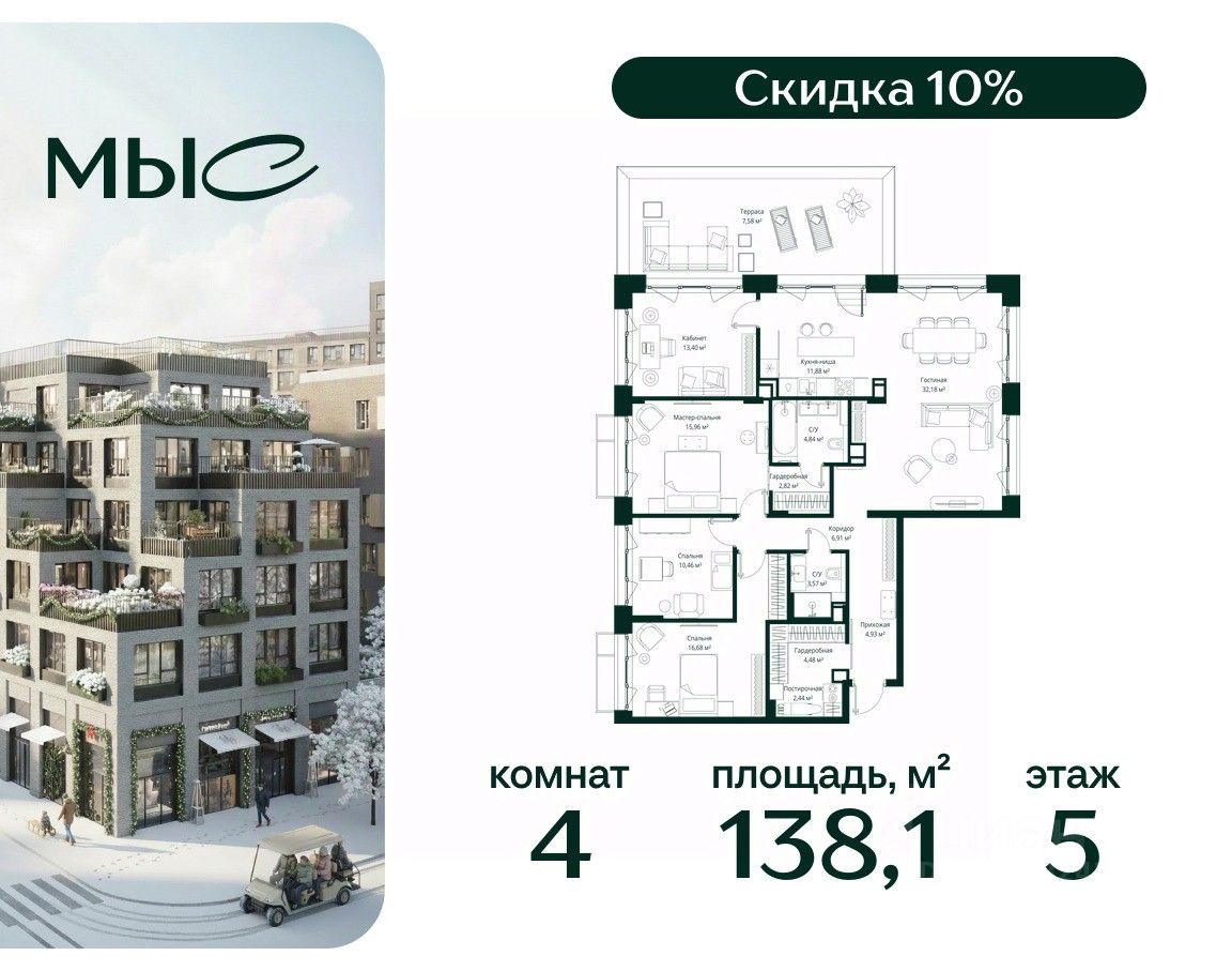 Продаётся 4-комнатная квартира общей площадью 138.13 м² без отделки в премиальном жилом комплексе "МЫС" на 5-м этаже 12 этажного дома. Квартира расположена в корпусе "Сибирь".