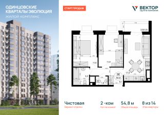 Продается 2-комн. кв-ра площадью 54,8 кв.м на 8 этаже 14 этажного дома в ЖК "Одинцовские кварталы Эволюция" от Группа компаний Вектор. Жилой комплекс "Одинцовские кварталы Эволюция" расположен в окружении живописного леса и исторических стародачных поселков, создавая атмосферу загородного уюта и культурной ценности. Этот район всегда считался престижным: здесь жили ученые, писатели и деятели искусства, что придает комплексу особый характер.