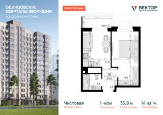 Продается 1-комн. квартира площадью 36,1 кв.м на 14 этаже 14 этажного дома в ЖК "Одинцовские кварталы Эволюция" от федерального девелопера ГК "Вектор".