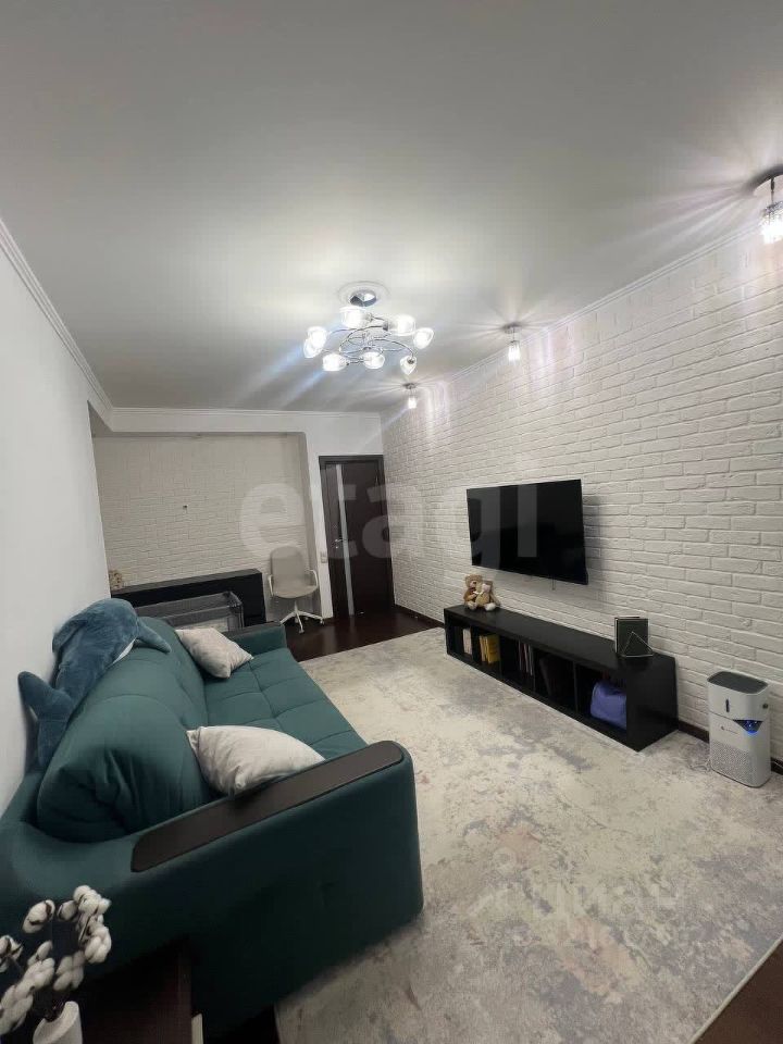 Паркетная доска, цвет венге. Стены: сочетание окрашенных стен и стен, выложенных гипсовыми "кирпичиками". Покрашено в 2020 - обновлено в 2024 году. Краска моющаяся. Освещение: центральная люстра, боковые и точечные светильники. Окно выходит на балкон.