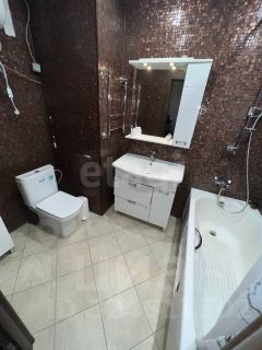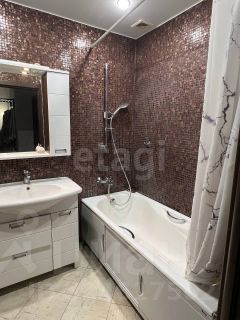 Пол - плитка светло бежевого цвета, стены - темно коричневая мозаика. Электрический подогрев полов с регулировкой силы нагрева, в рабочем состоянии. Бойлер новый, устанавливался летом 2025 года. Потолок натяжной, точечное освещение.