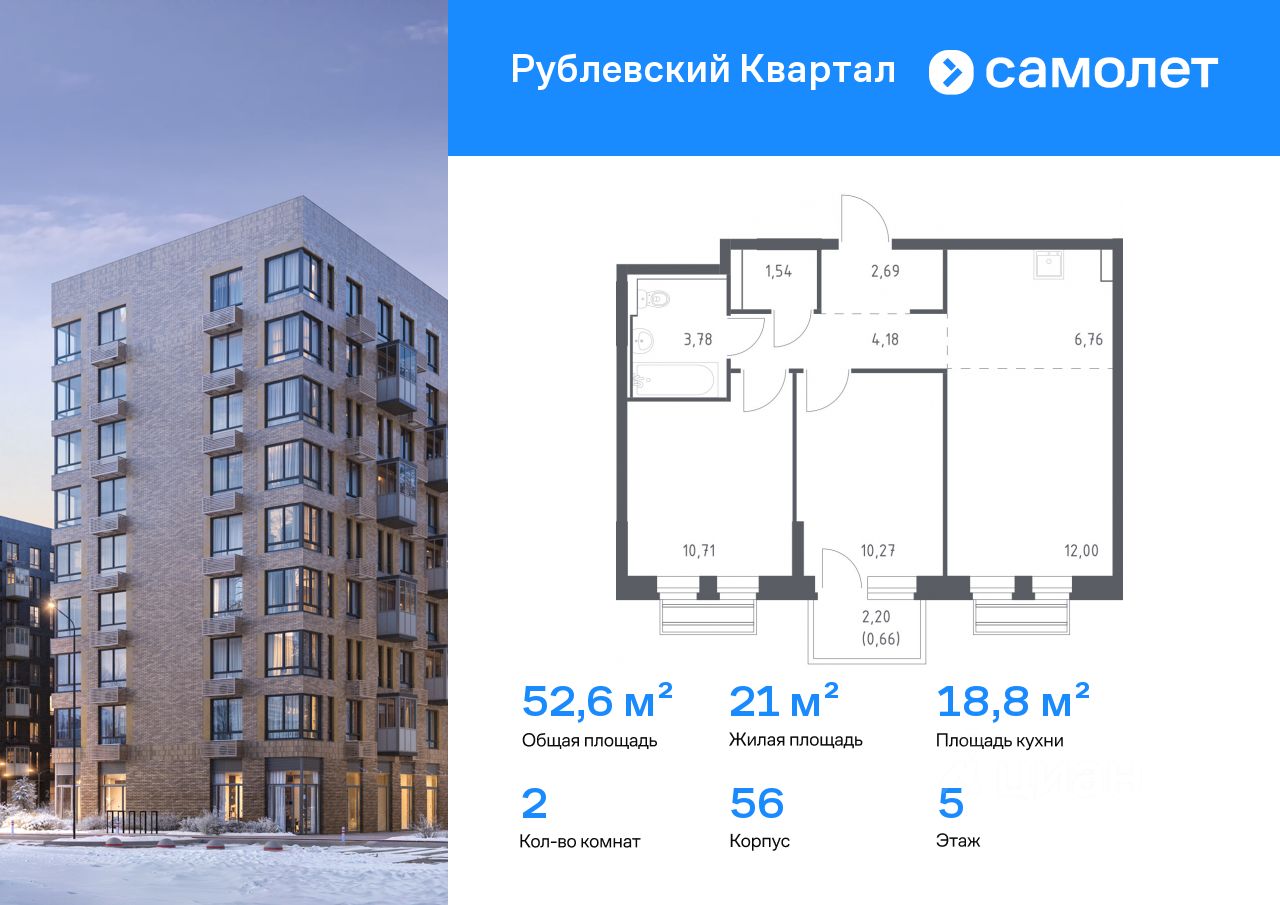 Строим кварталы для жизни с заботой о будущем. Предлагается 2-комнатная квартира комфорт-класса 52,59 кв.м в корпусе 56 на 5 этаже, в ЖК "Рублевский Квартал"