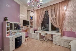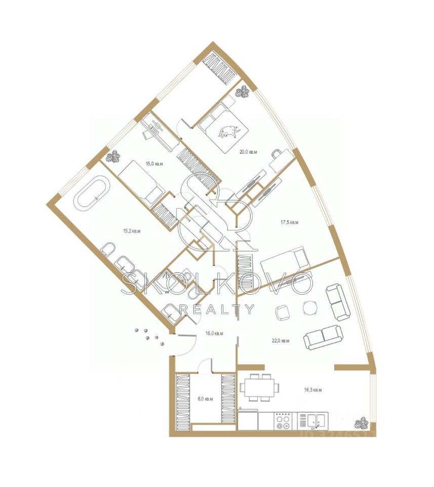 Пространство квартиры организовано максимально эффективно и включает кухню, объединённую с гостиной, мастер-спальню, две детские спальни, три санитарных узла и гардеробную комнату.