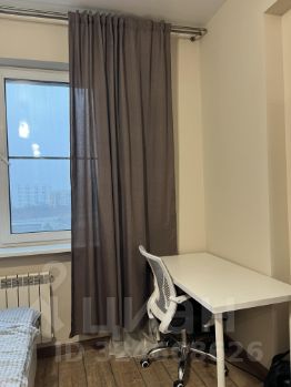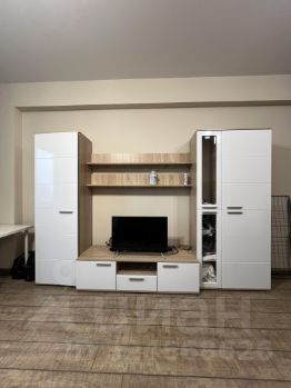 В зоне спальной кровать с подъемным механизмом. Шкаф с полочками и телевизором. Шторы сшиты на заказ из плотного бархатного материала.