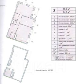 По плану в квартире 2 изолированные комнаты, просторная кухня-гостиная, большая лоджия и два сан.узла. Две комнаты в квартире с несколькими окнами, при желании можно сделать 4-х комнатную квартиру. 12-й этаж выгодно отличается квартирами с самыми высокими потолками в доме (3,65 м). Панорамные окна, в том числе и на лоджии с прекрасным видом на лесной массив.