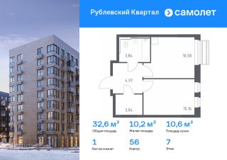 Строим кварталы для жизни с заботой о будущем. Предлагается 1-комнатная квартира комфорт-класса 32,59 кв.м в корпусе 56 на 7 этаже, в ЖК "Рублевский Квартал"