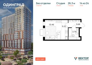 Прямая продажа от застройщика. Продается квартира-студия площадью 26,3 кв.м на 14 этаже 24 этажного дома в ЖК "Одинград" от федерального девелопера ГК "Вектор".
