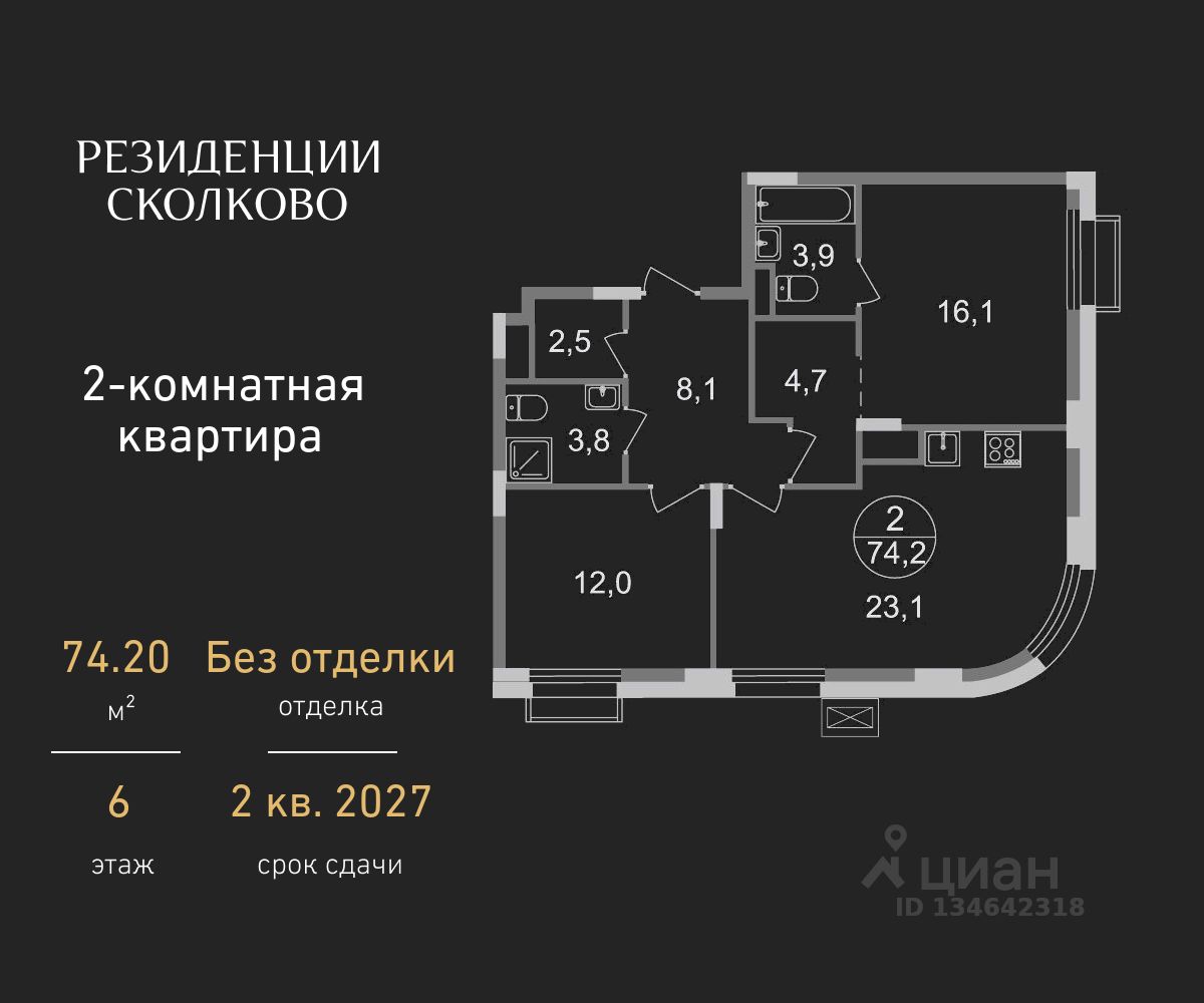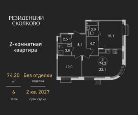 Общая площадь квартиры - 74,2 кв. м, этаж 6 из 9.