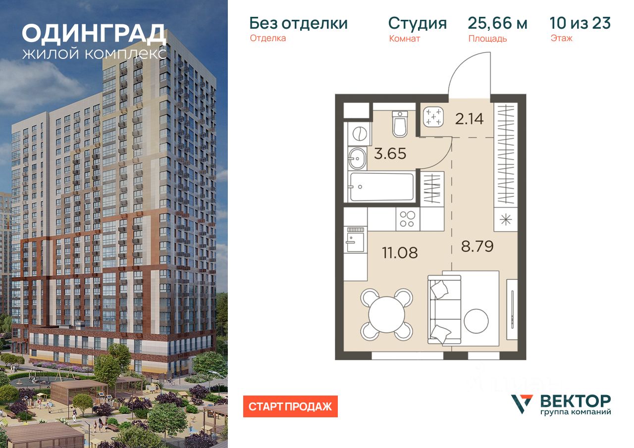 Прямая продажа от застройщика. Продается квартира-студия площадью 25,66 кв.м на 10 этаже 23 этажного дома в ЖК "Одинград" от федерального девелопера ГК "Вектор".
