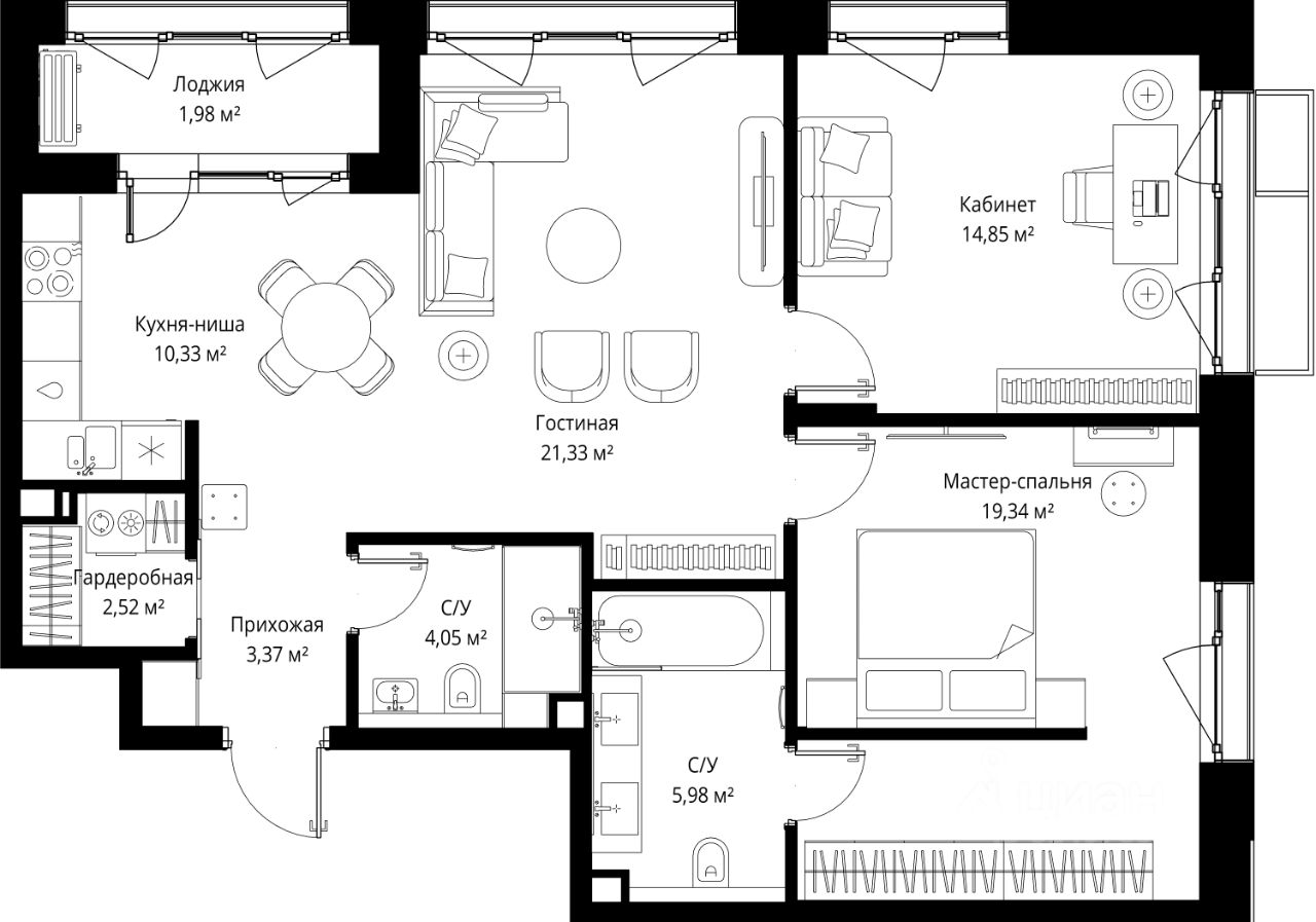 Продаётся 2-комнатная квартира общей площадью 83.75 м² без отделки в премиальном жилом комплексе "МЫС" на 7-м этаже 12 этажного дома. Квартира расположена в корпусе "Сибирь".
