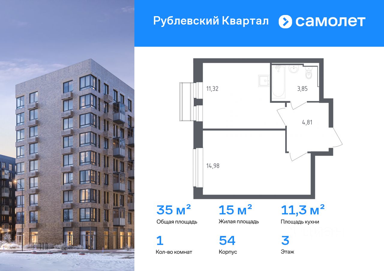 Строим кварталы для жизни с заботой о будущем. Предлагается 1-комнатная квартира комфорт-класса 34,96 кв.м в корпусе 54 на 3 этаже, в ЖК "Рублевский Квартал"