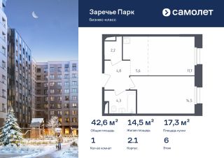 Строим кварталы для жизни с заботой о будущем. Предлагается 1-комнатная квартира бизнес-класса 42,6 кв.м в корпусе 2.1 на 6 этаже, в ЖК "Заречье Парк"