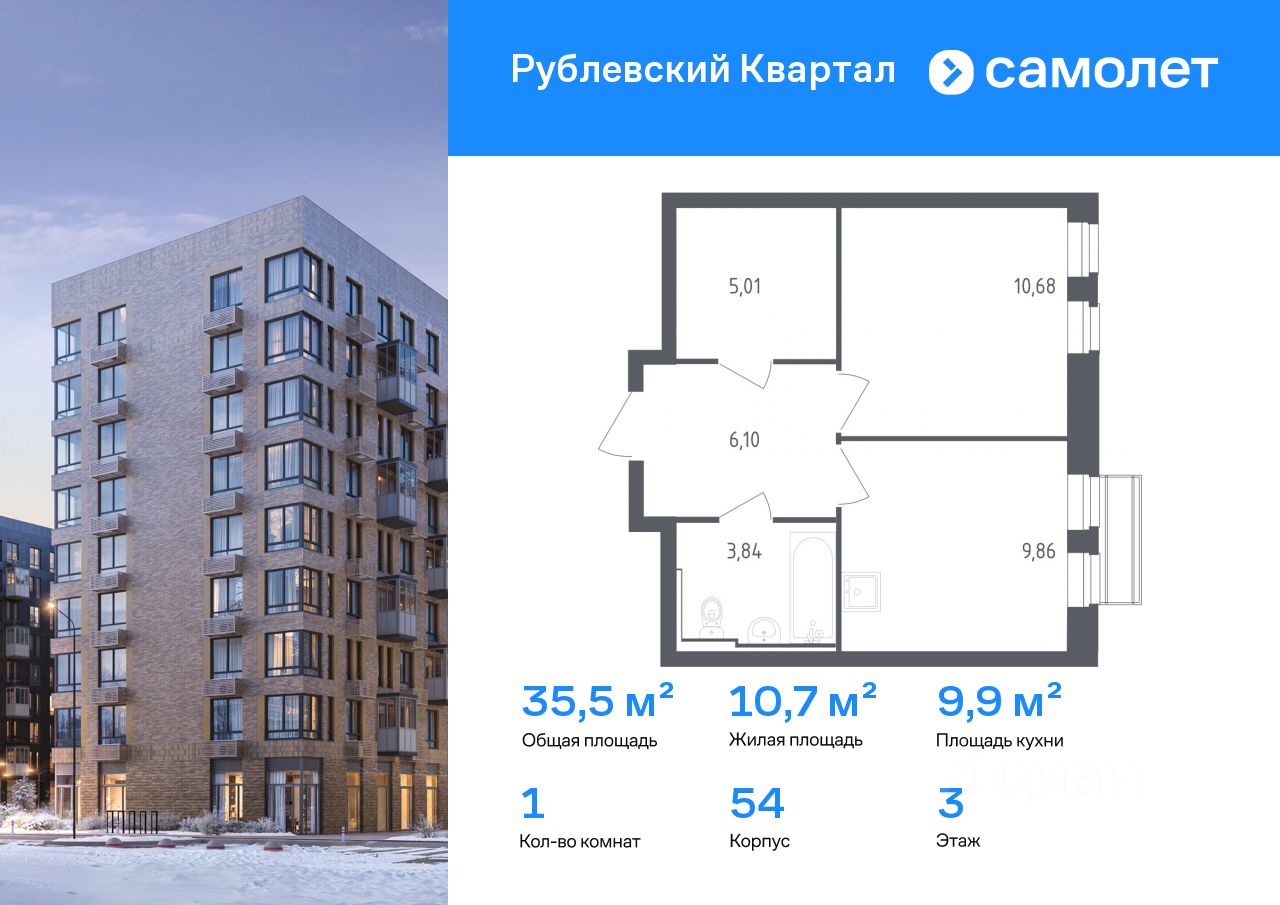 Строим кварталы для жизни с заботой о будущем. Предлагается 1-комнатная квартира комфорт-класса 35,49 кв.м в корпусе 54 на 3 этаже, в ЖК "Рублевский Квартал"