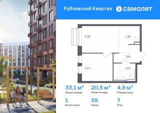 Строим кварталы для жизни с заботой о будущем. Предлагается 1-комнатная квартира комфорт-класса 33,05 кв.м в корпусе 55 на 5 этаже, в ЖК "Рублевский Квартал"