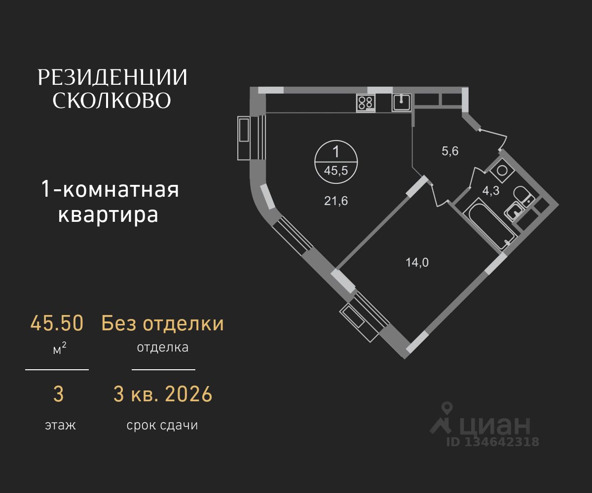 Общая площадь квартиры - 45,5 кв. м, этаж 3 из 9.