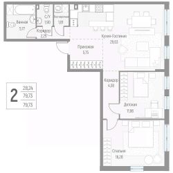 Продаётся 2-комнатная квартира общей площадью 79,5 м² на 1-м этаже 4 этажного дома. Дом сдан.