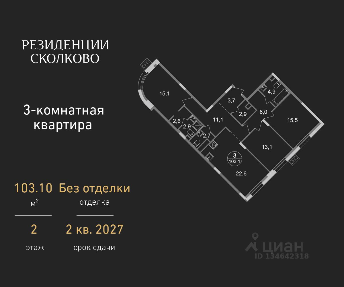 Общая площадь квартиры - 103,1 кв. м, этаж 2 из 9.