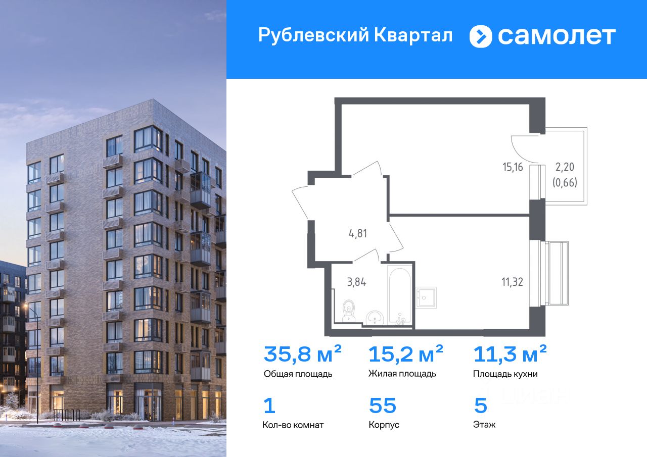 Строим кварталы для жизни с заботой о будущем. Предлагается 1-комнатная квартира комфорт-класса 35,79 кв.м в корпусе 55 на 5 этаже, в ЖК "Рублевский Квартал"
