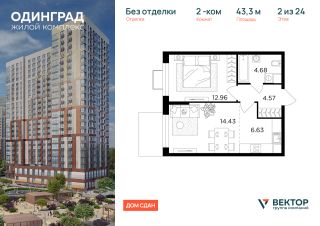 Прямая продажа от застройщика. Продается 2-комн. квартира площадью 43,3 кв.м на 2 этаже 24 этажного дома в ЖК "Одинград" от федерального девелопера ГК "Вектор".