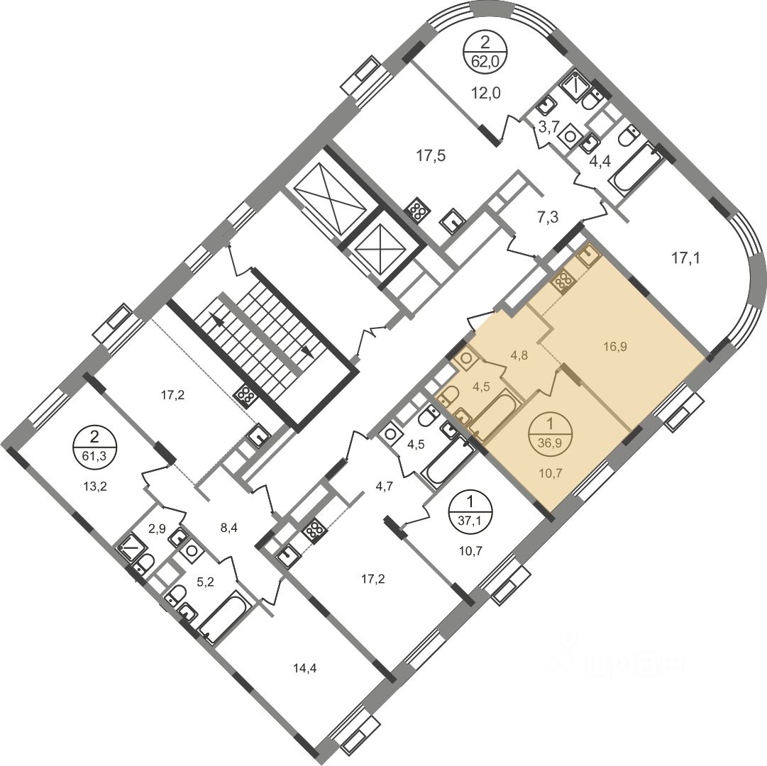 Общая площадь квартиры - 36,9 кв. м, этаж 5 из 9.