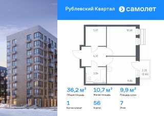 Строим кварталы для жизни с заботой о будущем. Предлагается 1-комнатная квартира комфорт-класса 36,15 кв.м в корпусе 56 на 7 этаже, в ЖК "Рублевский Квартал"