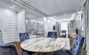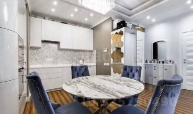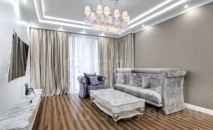 Объект отличается безупречным состоянием и продуманной до мелочей планировкой, включающей оборудованную гардеробную комнату. В отделке использованы дорогие материалы: мрамор в оформлении журнального стола и ниши под телевизор, оникс в санузле с душевой кабиной.