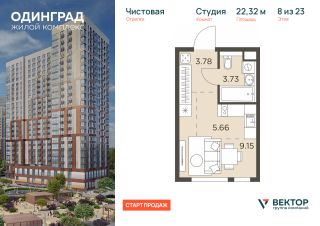 Прямая продажа от застройщика. Продается квартира-студия площадью 22,32 кв.м на 8 этаже 23 этажного дома в ЖК "Одинград" от федерального девелопера ГК "Вектор".