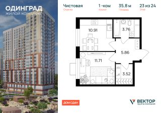 Прямая продажа от застройщика. Продается 1-комн. квартира площадью 35,8 кв.м на 23 этаже 24 этажного дома в ЖК "Одинград" от федерального девелопера ГК "Вектор".