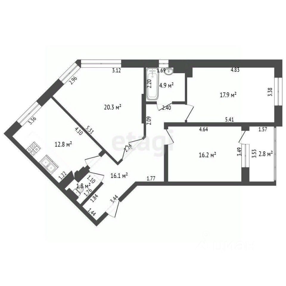 - функциональная планировка включающая просторную кухню 12.8 м2, три комнаты, одна из которых с лоджией и два санузла.