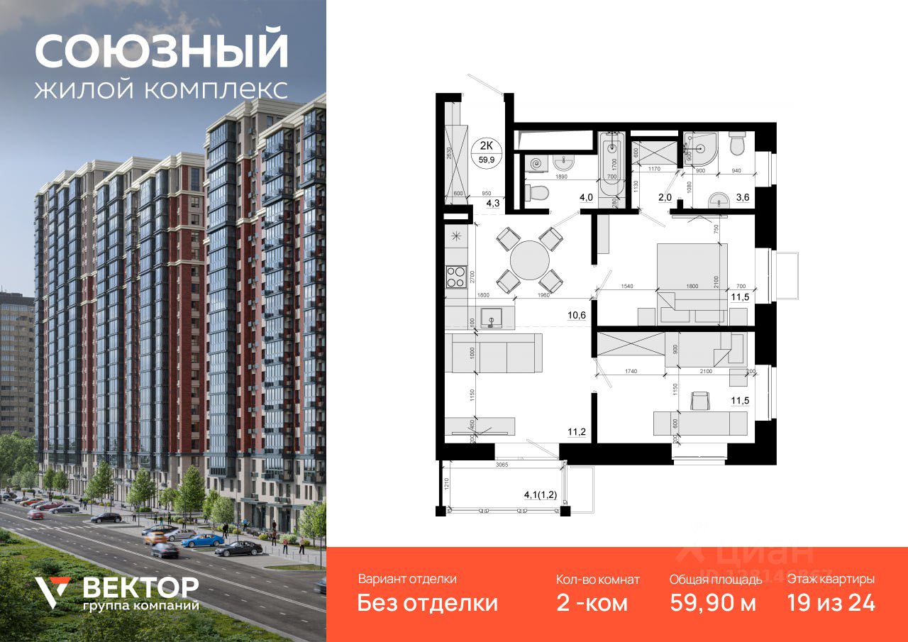 Продается 2-комн. квартира площадью 59,9 кв.м на 19 этаже 24 этажного дома в ЖК "Союзный" от федерального девелопера ГК "Вектор".