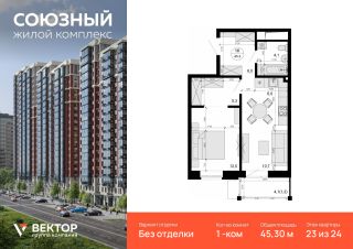 Продается 1-комн. квартира площадью 45,3 кв.м на 23 этаже 24 этажного дома в ЖК "Союзный" от федерального девелопера ГК "Вектор".
