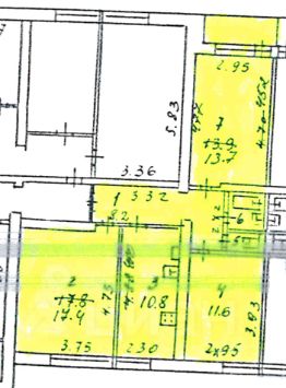 Общая площадь по ЕГРН — 64,5 кв. м. Большая кухня 10,8 кв. м, три изолированные комнаты 17,4 / 13,7 / 11,6 кв. м. Планировка позволяет при желании объединить кухню с комнатой.