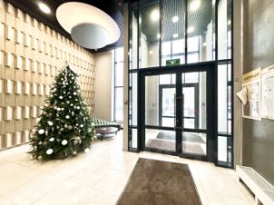 Жилой комплекс бизнес-класса, имеет ряд преимуществ: консьерж, охраняемый закрытый паркинг с входом в подъезд, территория двора расположена на стилобате - вход только по электронным пропускам для жильцов. Входная группа представлена просторным холлом с высокими потолками и вместительными лифтами. На первых этажах расположены коммерческие помещения: пекарни, аптеки, продуктовые магазины, салон красоты и т.д. Рядом автозаправочная станция, мойка автомобилей, шиномонтаж.