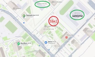Детям: Дом расположен на углу между детским садом и школой.
