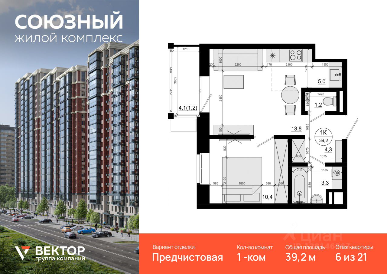Продается 1-комн. квартира площадью 39,2 кв.м на 6 этаже 21 этажного дома в ЖК "Союзный" от федерального девелопера ГК "Вектор".