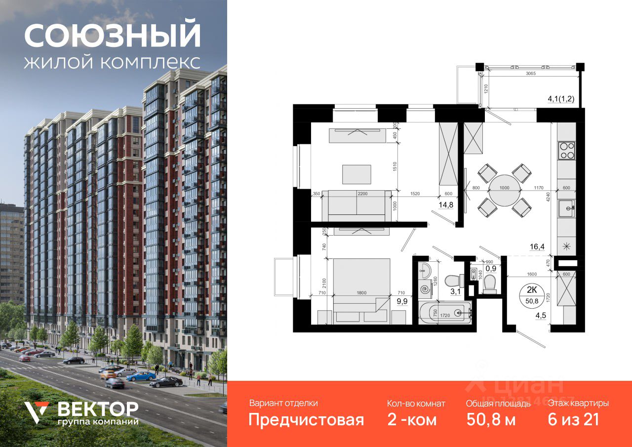 Продается 2-комн. квартира площадью 50,8 кв.м на 6 этаже 21 этажного дома в ЖК "Союзный" от федерального девелопера ГК "Вектор".